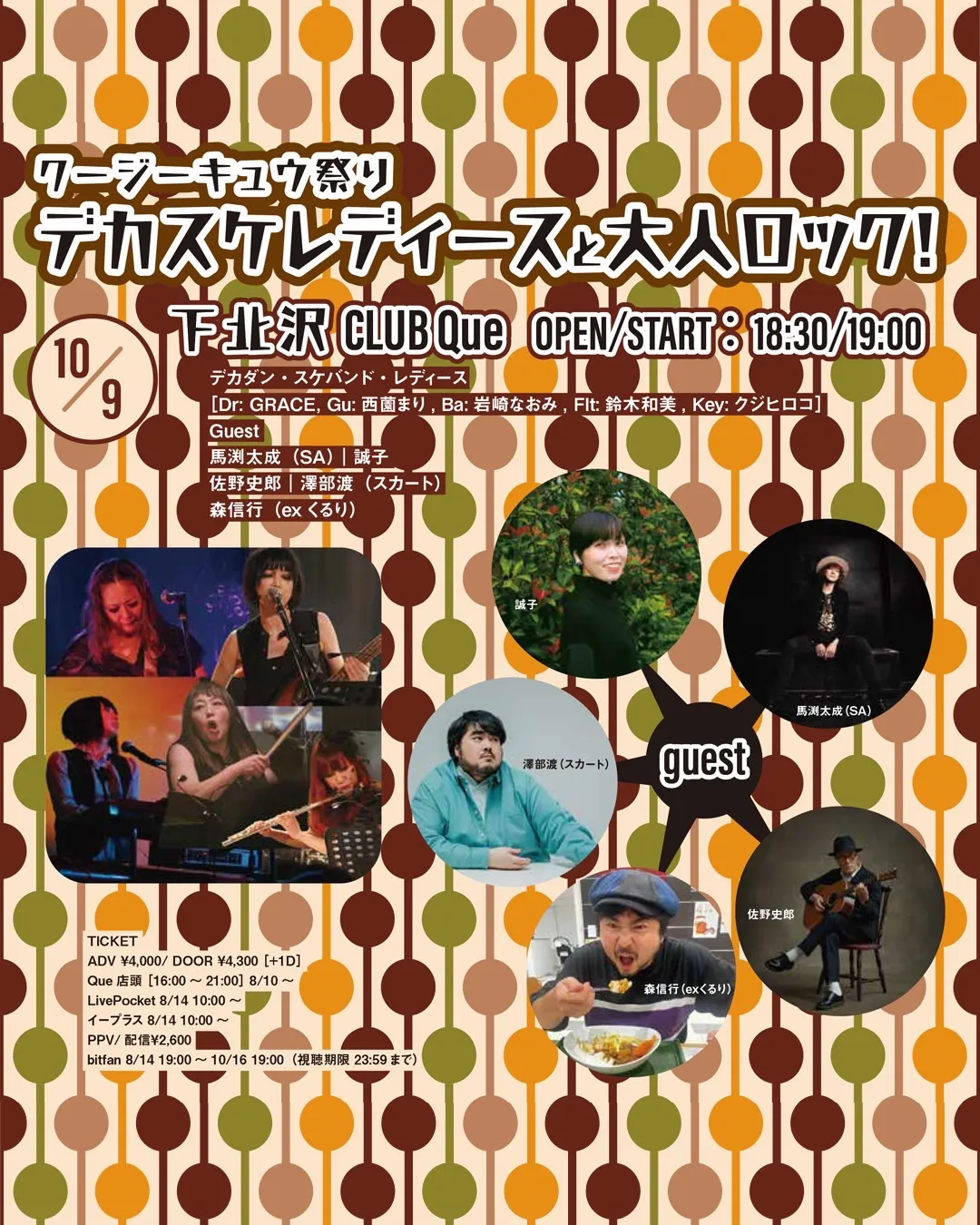 クージーキュウ祭り「デカスケレディースと大人ロック!」 日時 2025年10月9日(木) OPEN 18:30 / START 19:00 会場 下北沢 CLUB Que 出演 デカダンス・スケバンド・レディース Dr: GRACE Gu: 西薗まり Ba: 岩崎なおみ Fl: 鈴木和美 Key: クシヒロ...